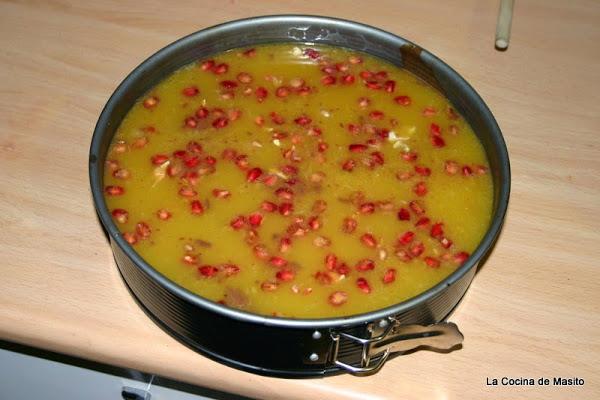 Sobre la gelatina de naranja yo le puse granadas, pero eso es opcional, si no queréis poner nada o poner unas frambuesas como hace javier es otra buena opción, ahí cada maestrillo tiene su librillo.