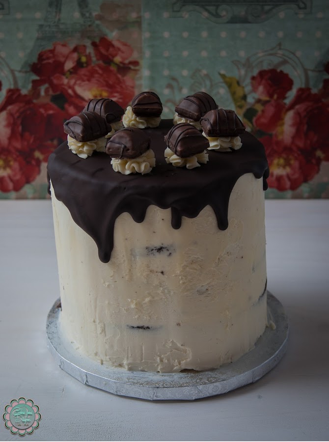 4) Cubrimos y decoramos al gusto. Para hacer el efecto drip, he fundido el chocolate negro y la mantequilla y lo he puesto por encima de la tarta cubierta y bien fría, si tenéis un biberón de cocina, os puede venir bien. Luego he hecho unos rosetones de crema de la del relleno y la cobertura y he colocado unos mini Kinder Bueno.