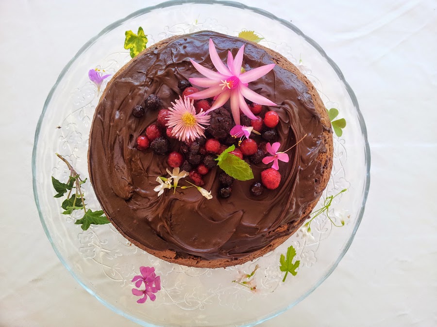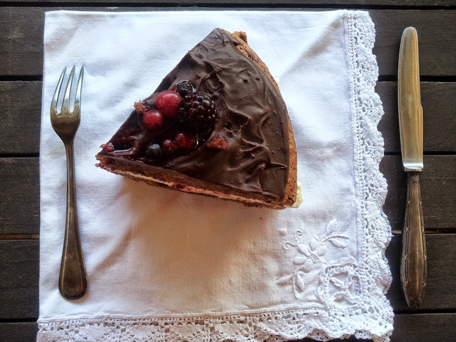 tarta de chocolate con mermelada de fresa, chantilly y cobertura de chocolate con frutos rojos (chocolate cake with strawberry jam, whipped cream and chocolate topping with berries)
