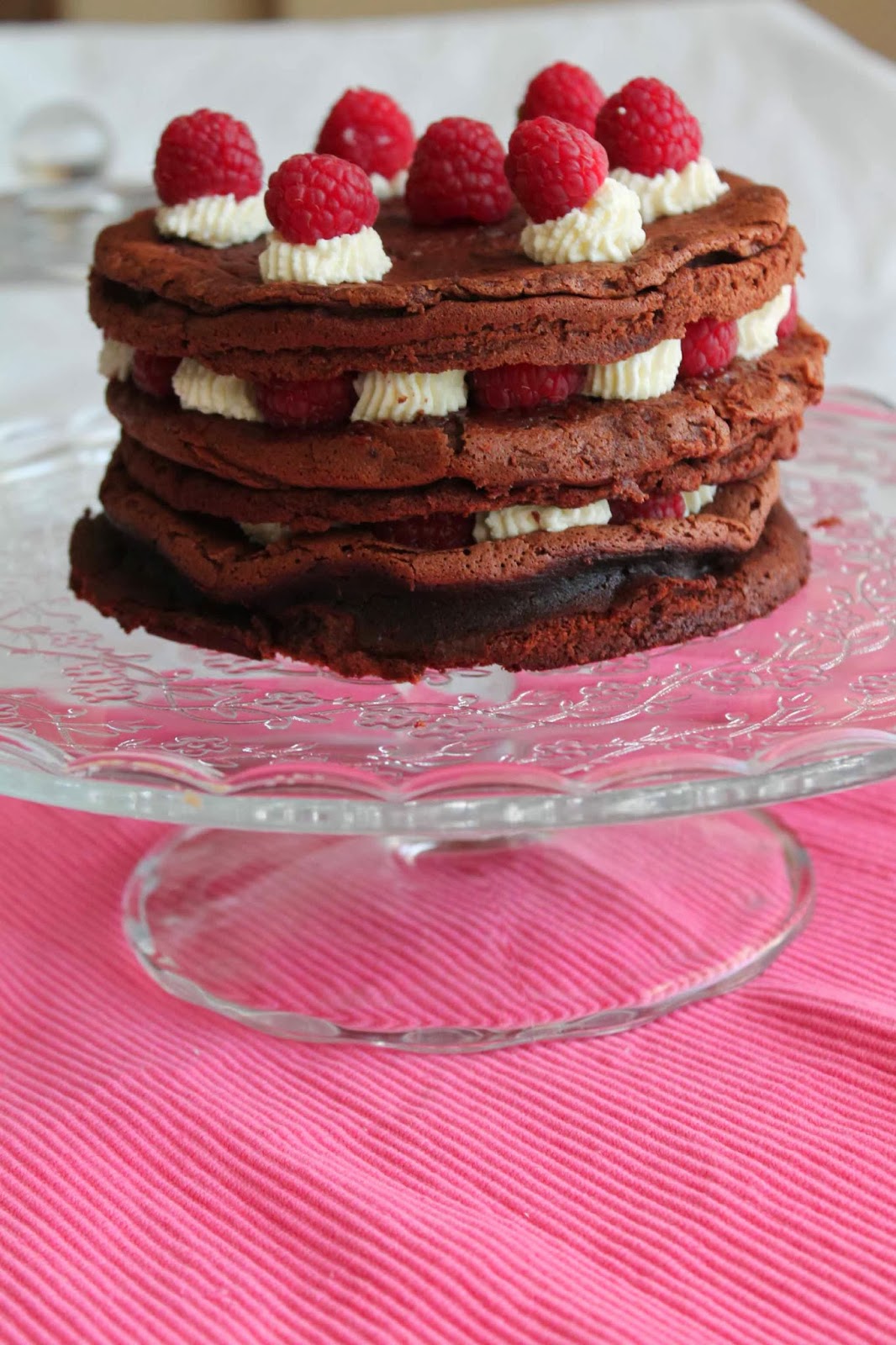 Esta propuesta muy delicada de sabor que tiene como base bizcocho de chocolate sin harina crujiente por fuera y con un interior jugoso colocado en capas rellenas de una mousse de requesón y frambuesas. Para la preparación de la mousse de requesón he adaptado la receta de Pierre Hermé.