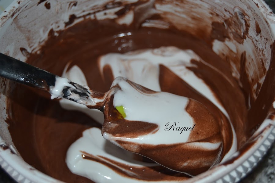 Añadimos a la mezcla que tiene el chocolate una tercera parte del merengue y mezclamos con movimientos envolventes y así en dos veces mas con el resto hasta estar totalmente mezclado.