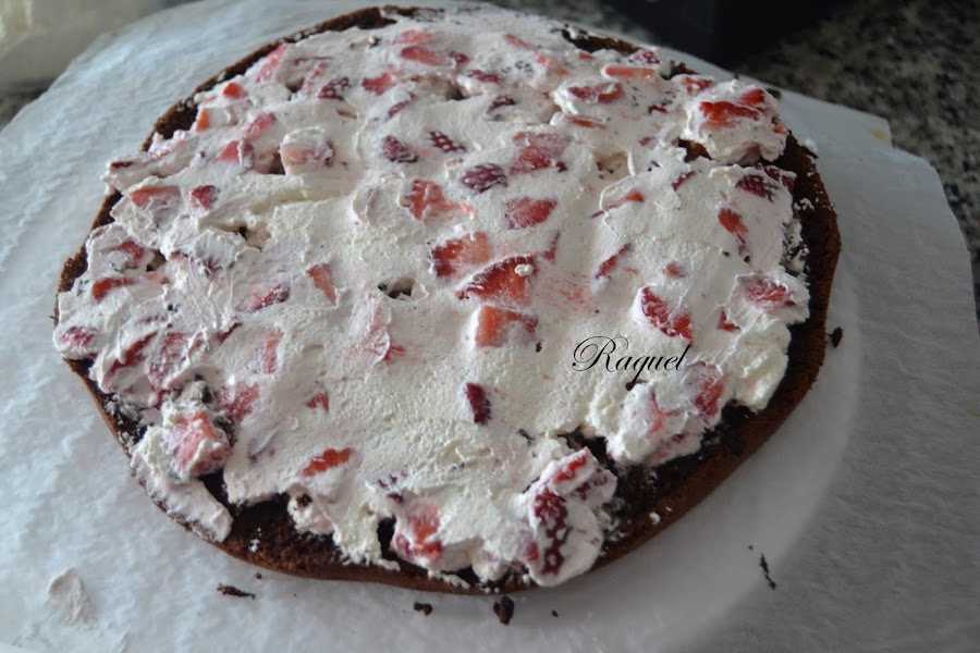 Cogemos ocho fresas o diez fresas y las hacemos a trozos pequeños mezclamos con una parte de la nata (crema de leche) y la ponemos sobre una parte del bizcocho.