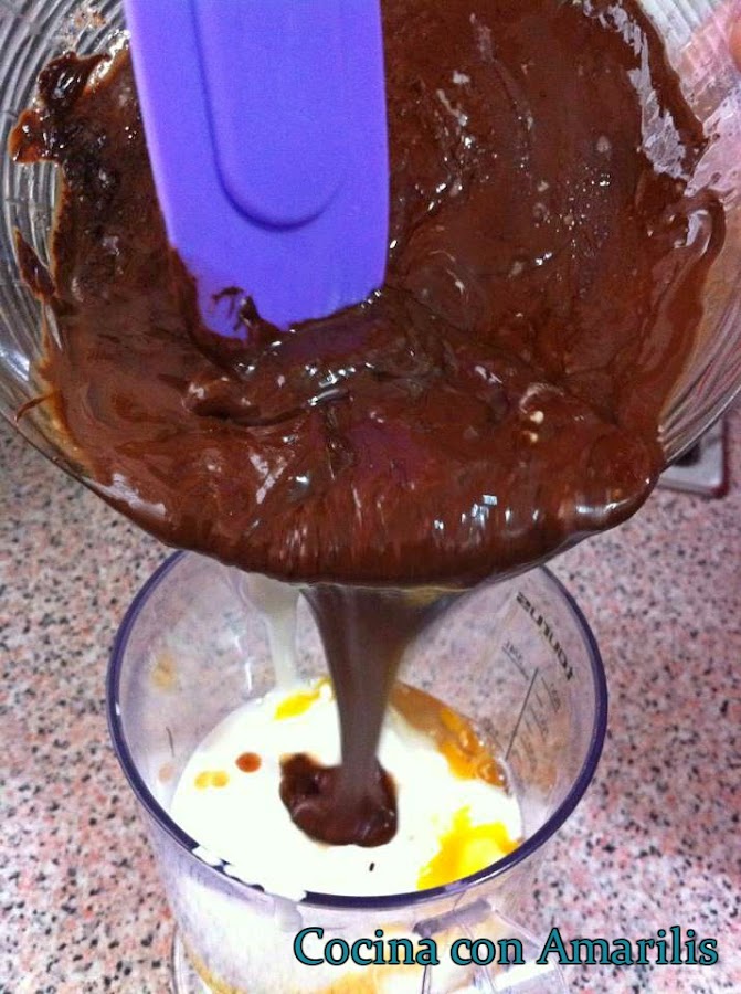 * Ahora preparamos el relleno; ponemos todos los ingredientes en el vaso del batidor incluido el chocolate diluido en el microondas, con un poquito de mantequilla anteriormente y batimos hasta que estén todos los ingredientes integrados.