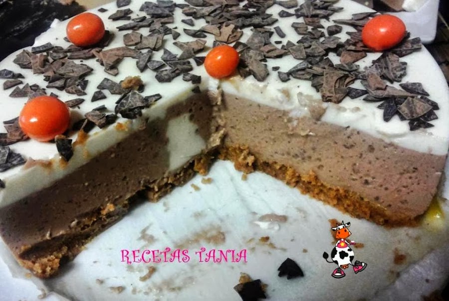 Trituramos unas 30 galletas (tipo maría), para hacer la base de la tarta. Una vez trituradas las ponemos en un bol y añadimos unas 3 cucharadas de mantequilla derretida (microondas) y poco a poco vamos añadiendo leche hasta tener una masa,la ponemos en la base de un molde desmontable extendiéndola bien con los nudillos y lo metemos en la nevera.