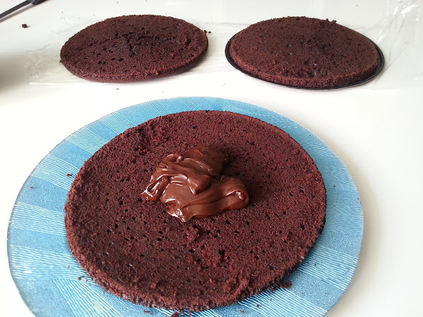 4. - Metemos la crema de chocolate en el microondas un minuto, para que se nos ponga más líquida, y ponemos una fina capa sobre cada corte,