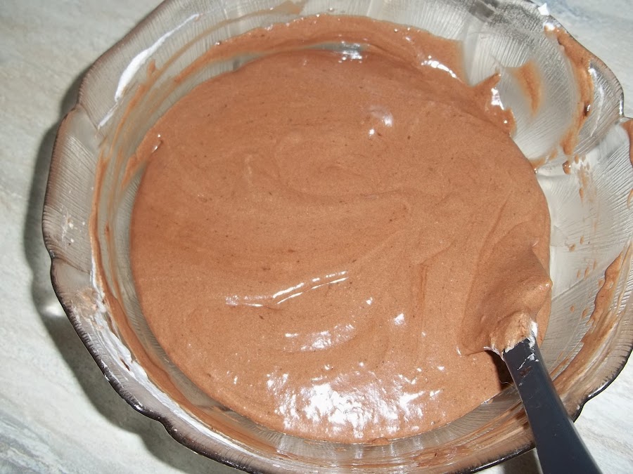 Precalentamos el horno a 180º con aire. Incorporamos las claras a la mezcla anterior y mezclamos con cuidado a mano, con movimientos envolventes.
