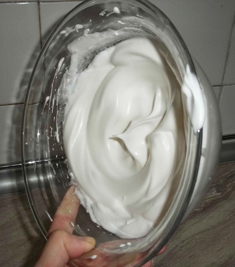 A continuación montamos las claras a punto de nieve junto con el azúcar (para que monten bien el bol debe de estar muy limpio, empezamos a batir las claras y cuando empiecen a montar vamos añadiendo poco a poco el azúcar, como si fuera un hilo, sin dejar de batir en ningún momento), estarán bien montadas las claras si al poner el bol de lado no se caen.