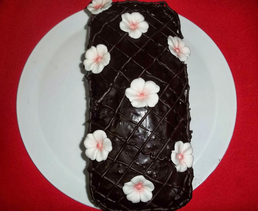 Como me ha sobrado trufa, lo que he hecho ha sido utilizarla para decorar la tarta dibujando un enrejado encima de ella. También he hecho unas flores con fondat blanco y purpurina comestible para decorar.