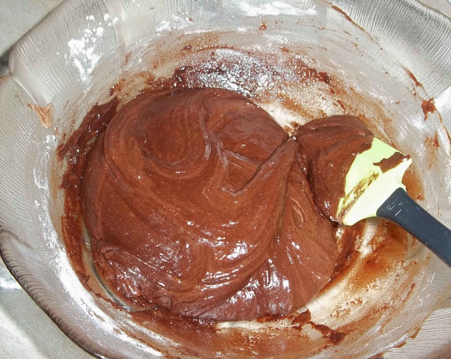 Por otro lado derretimos el chocolate con la mantequilla (al baño maría o en el microondas en tandas de 30 segundos y entre tanda y tanda removemos bien el chocolate para que no se queme y se deshaga bien). Una vez deshecho se lo añadimos a la mezcla de las yemas y también le hechamos la harina, mezclamos todo esto a mano.