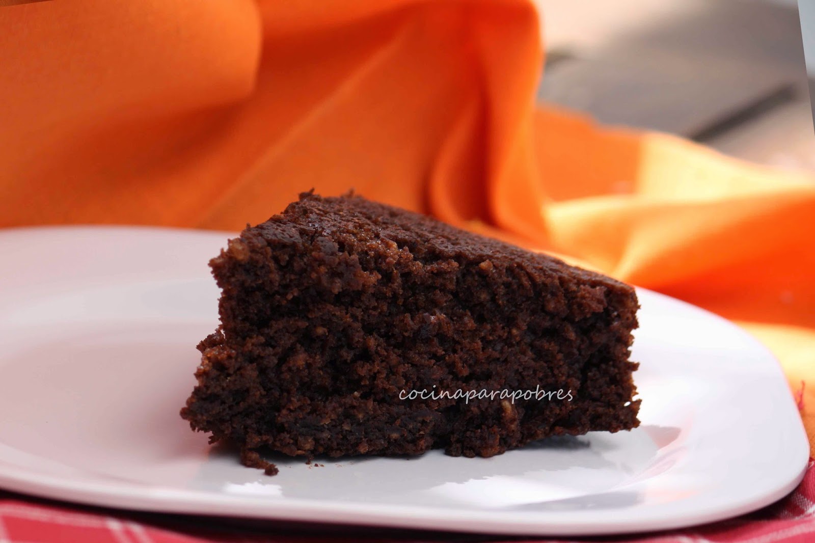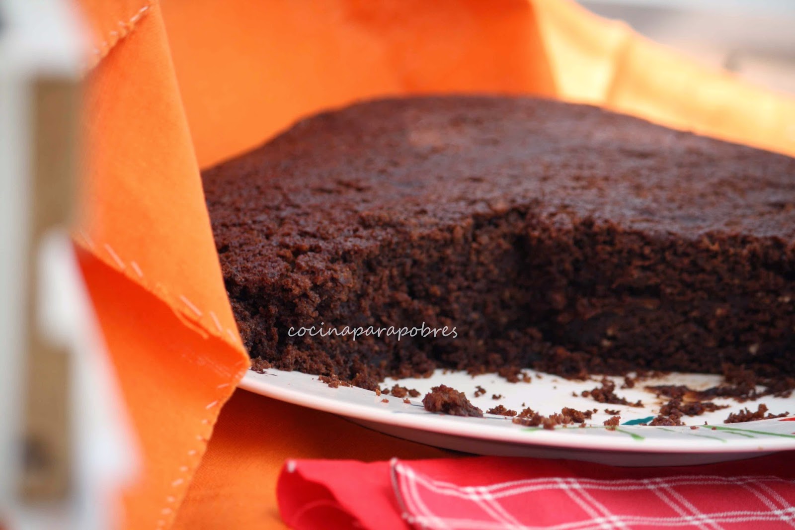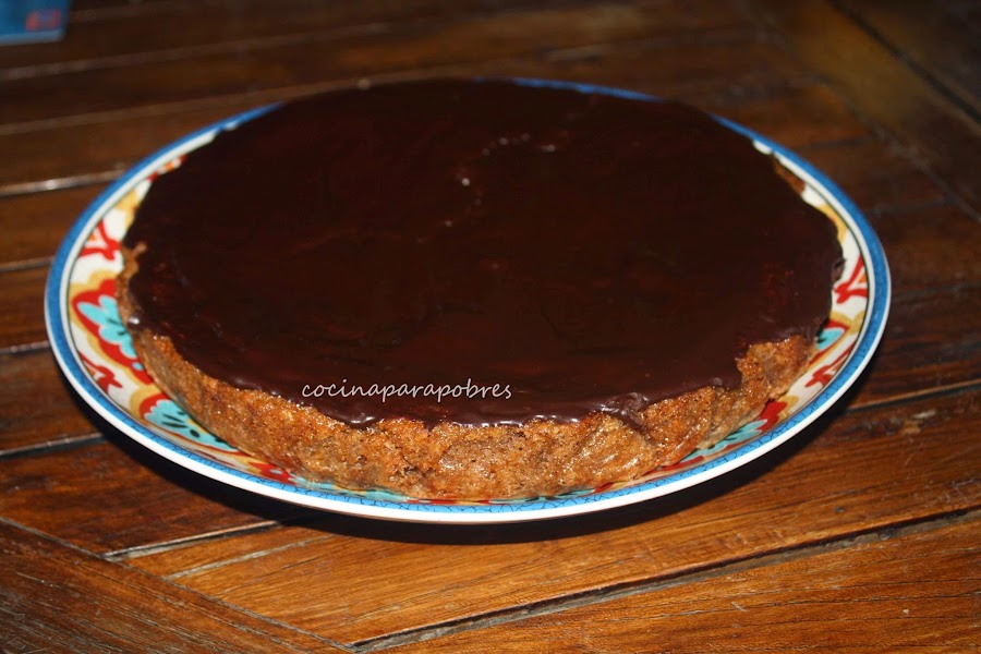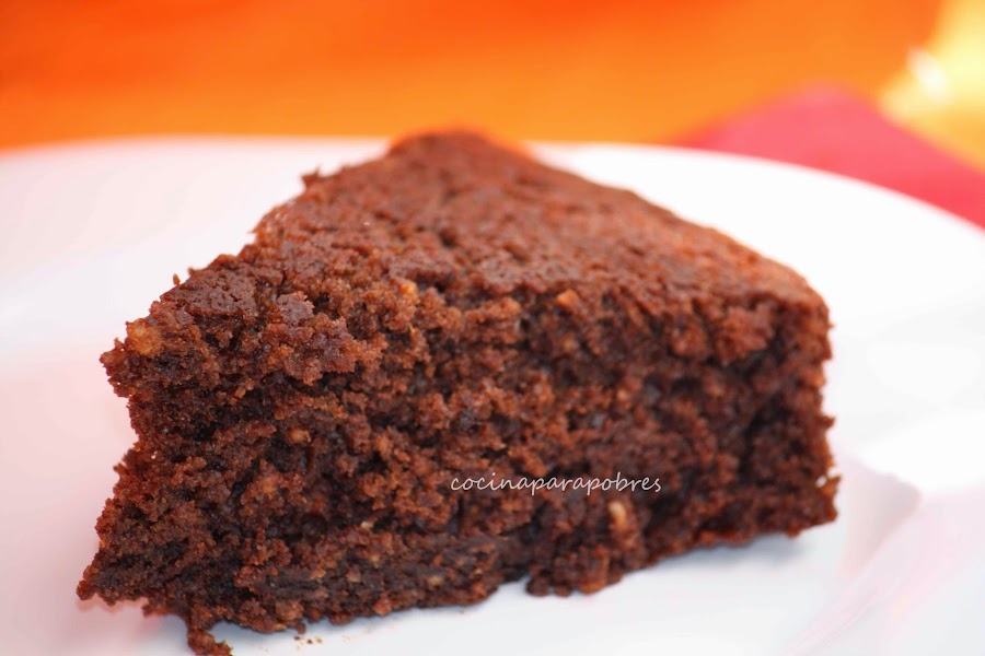 Añadimos los huevos y harina, batimos muy bien con las varillas eléctricas hasta que la masa quede lisa y de color más pálido, vertemos la masa en un molde previamente engrasado y forrado con papel de hornear.Hornear durante 50 minutos con el horno precalentado a 180- 190 ºC , dejamos reposar 10 minutos y desmoldamos y damos la vuelta para dejar enfriar.
