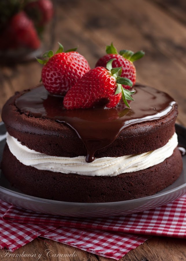 Volviendo a la tarta, si yo puedo hacerla, vosotros también. Dejaréis a más de uno con la boca abierta porque el resultado queda así de bonito y la combinación chocolate, fresas y nata (crema de leche) es éxito asegurado Vamos con la receta!