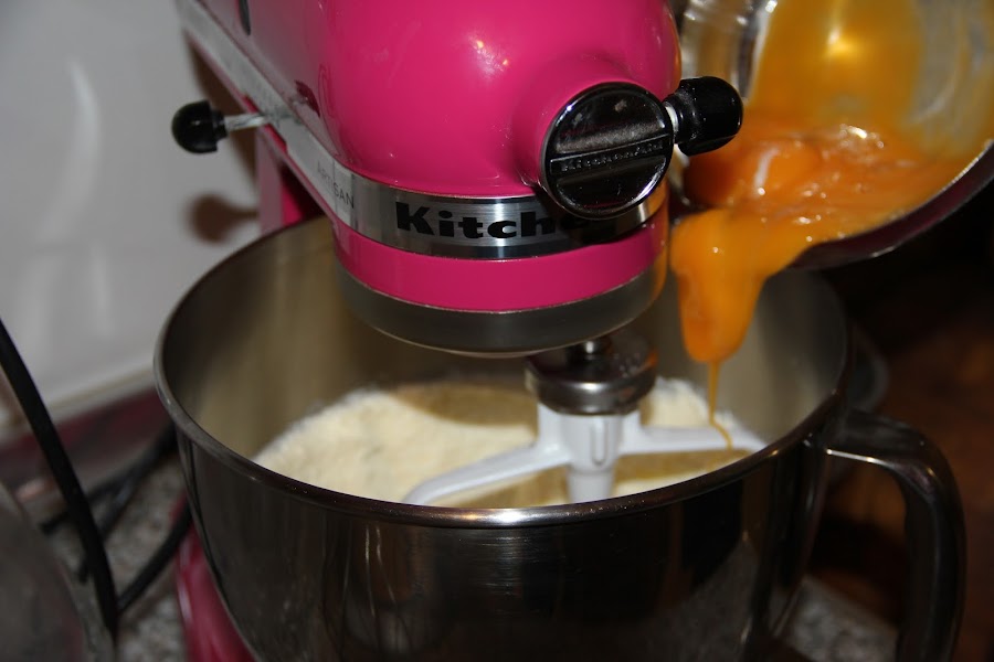 Batimos muy bien la mantequilla hasta que quede muy cremosa y añadimos, sin dejar de batir, el azúcar y las yemas.