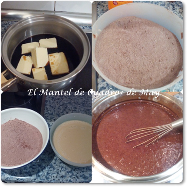 Una vez terminada la mezcla líquida, se va añadiendo poco a poco a los ingredientes sólidos, se bate enérgicamente con las varillas, deshaciendo los posibles grumos que se formen. Quedará una masa bastante líquida, pero cuando esté hecha quedará una textura jugosa y húmeda.