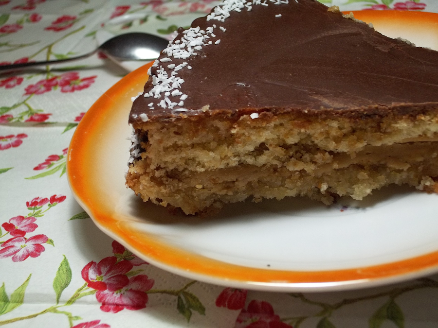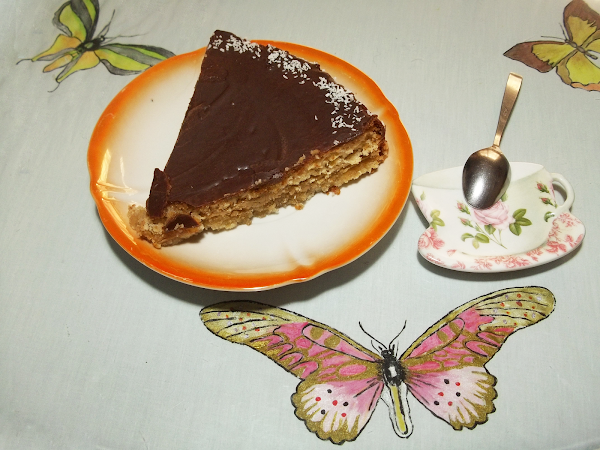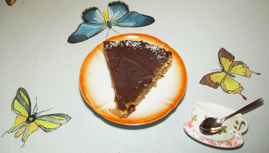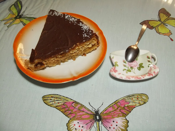 Cubrimos la tarta con el chocolate y espolvoreamos el coco por los lados.