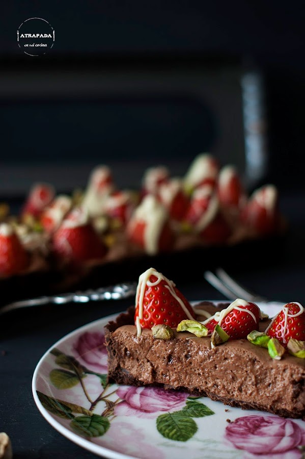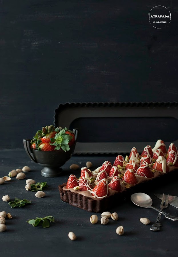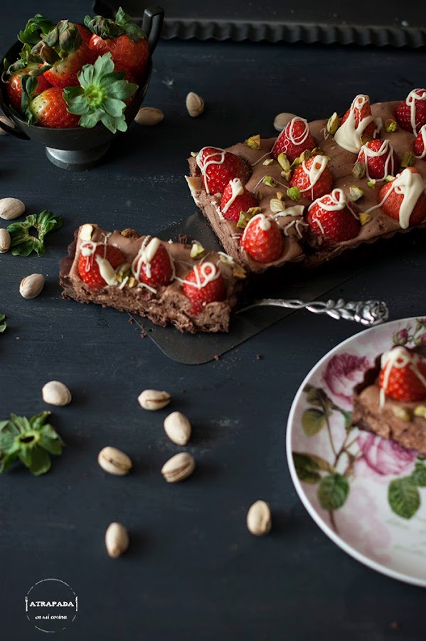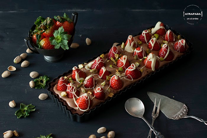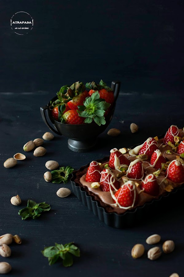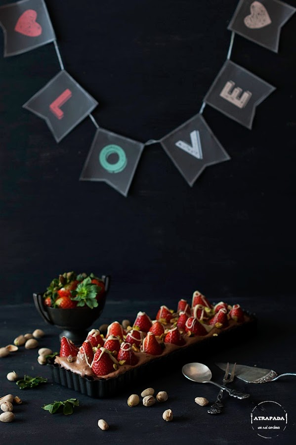 Mañana es San Valentín, y aunque últimamente se ha convertido en un día muy comercial, como tantas otras fechas, sí es verdad que nos gusta preparar algo especial para ese día. A las múltiples opciones de celebrarlo cenando fuera de casa y que nos ofrecen muchos restaurantes, también se une la posibilidad de preparar alguna cena especial en casa. Si es así yo os propongo el postre. El matrimonio de fresas con chocolate es una de las combinaciones que se repite en muchas elaboraciones y que nunca falla. La propuesta de hoy es una deliciosa tarta con una base de masa quebrada de chocolate, rellena de una suave mousse de Nutella (receta que he usado ya en varias ocasiones) y dentro unas fresas acompañadas de unos riquísimos pistachos americanos , que le dan un toque crujiente al topping de la tarta. El día 26 de febrero es el Día Mundial del Pistacho y con ésta receta voy a formar parte del #RetoPistacho. La receta de la masa quebrada de chocolate la ví a Miguel en su fantástico blog. Vamos con la receta.