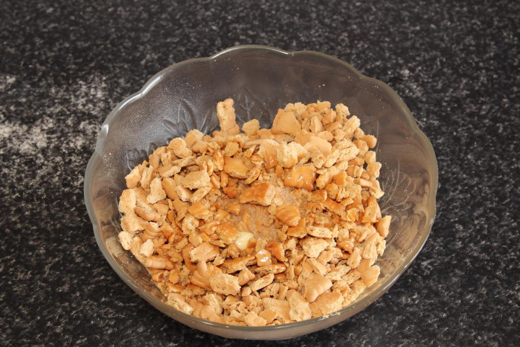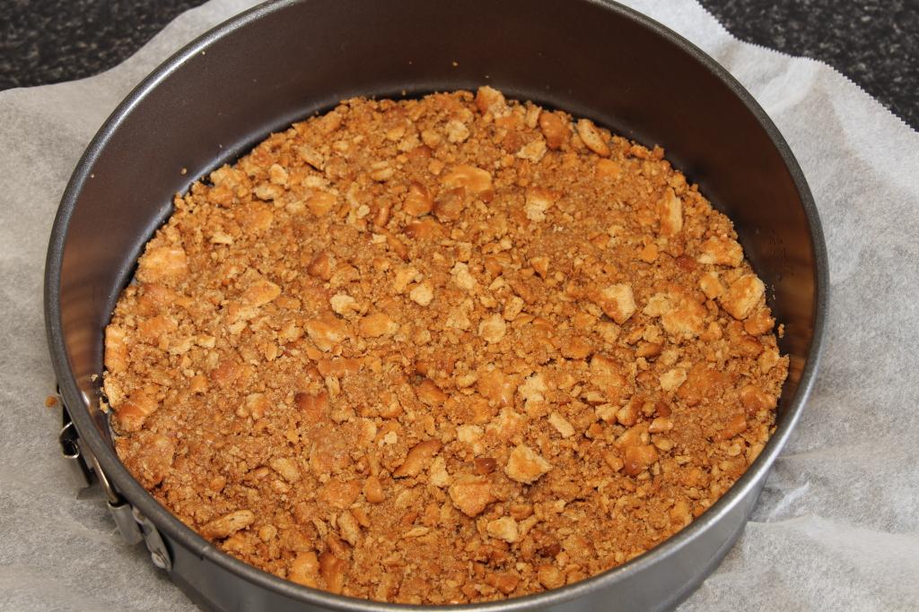 Trituramos las galletas (no es necesario que queden en polvo) en un mortero. Añadimos la mantequilla derretida. Mezclamos bien todo hasta que quede homogénea, debe quedar con aspecto arenoso. Extendemos la mezcla por el fondo del molde, presionamos bien con la mano o con el dorso de una cuchara de forma que quede toda la base del mismo grosor. La introducimos en el frigorífico.