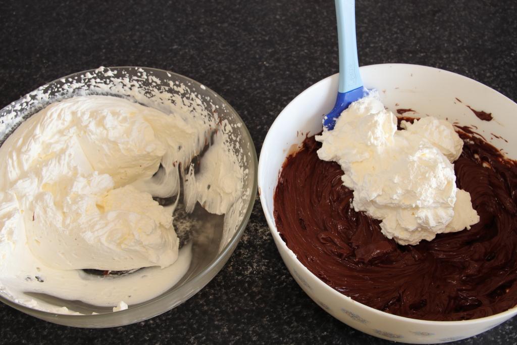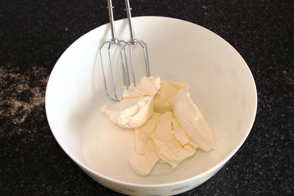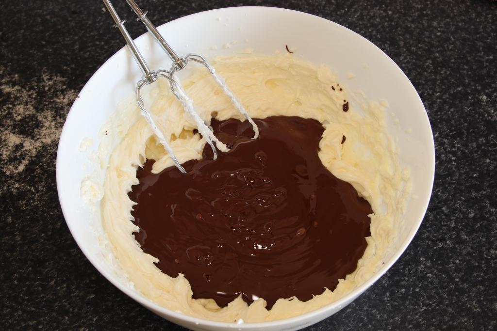 Mezclamos en un bol amplido el queso crema con el azúcar con ayuda de unas varillas eléctricas. Derretimos el chocolate a baño María ( o en el microondas vigilando que no se nos queme) y dejamos templar. Lo añadimos a la mezcla del queso hasta obtener una textura cremosa.