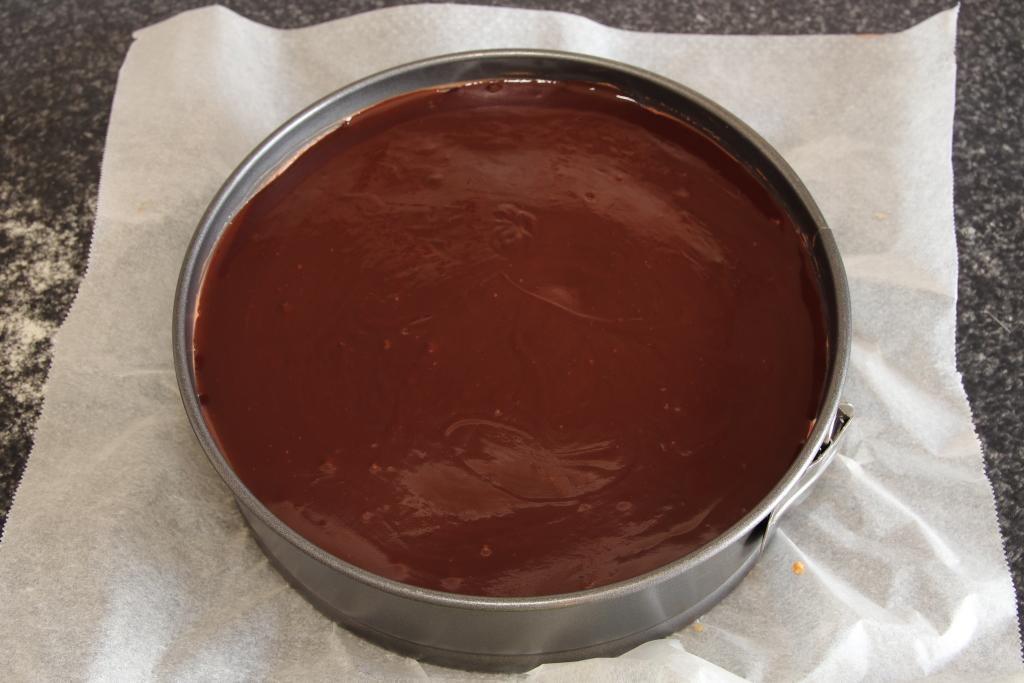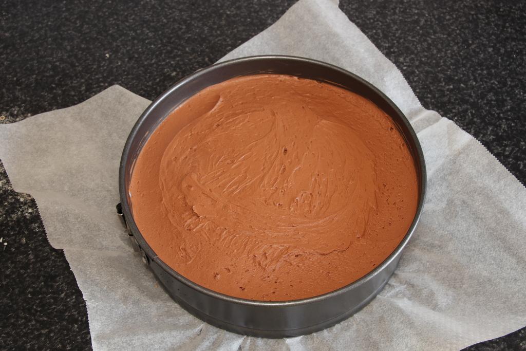 Sacamos la tarta del frigorífico, comprobamos que la superficie esta cuajada y vertemos con cuidado, repartimos bien meneando con cuidado el molde e introducimos de nuevo en la nevera. Conservar en la nevera por lo menos 5 horas para que se cuaje bien.