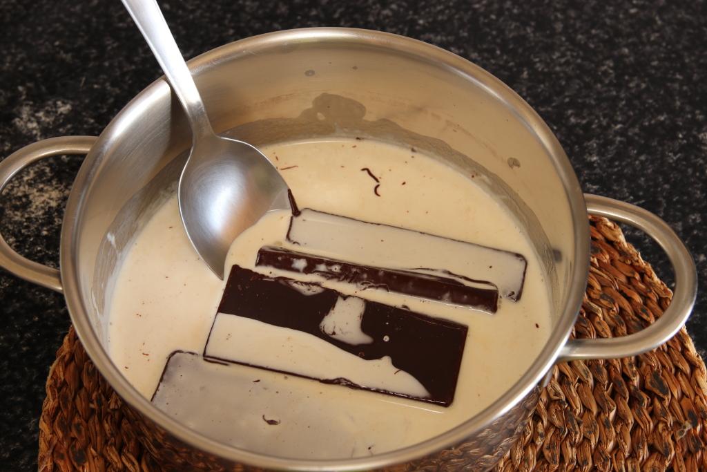 En un cazo calentamos la nata (crema de leche) hasta que rompa a hervir, retiramos del fuego y añadimos el chocolate troceado. Removemos hasta que se derrita, añadimos el licor, mezclamos y dejamos atemperar.