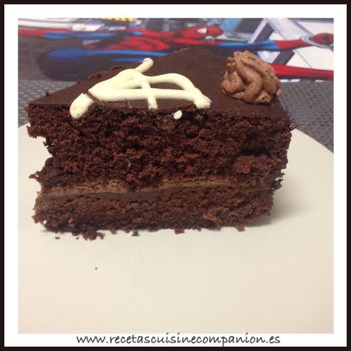 6. Con cuidado, ponemos la otra plancha del bizcocho encima de la trufa, y vamos extendiendo el chocolate de la cobertura por toda la tarta.