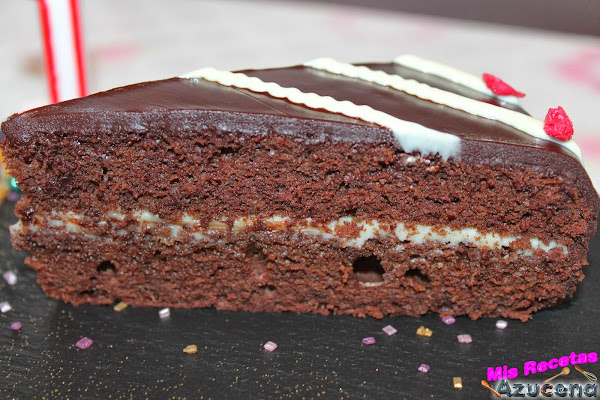 Una vez puesta la parte de arriba del bizcocho cogeremos el chocolate que preparamos para la cobertura y lo pondremos en el centro del bizcocho y dejaremos que caiga por los lados hasta cubrir todo el bizcocho.