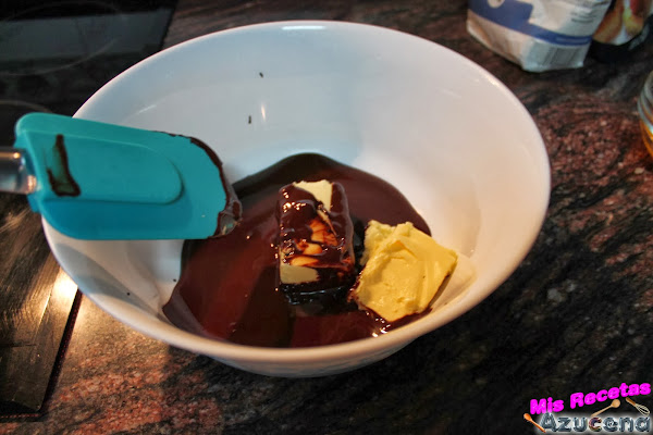 Una vez tengamos el chocolate listo los sacaremos y lo pondremos en un bol, al que añadiremos la mantequilla, removemos con ayuda de una lengua, al estar el chocolate caliente la derretirá enseguida.
