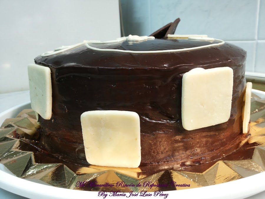 Recubriendo toda la tarta un baño de espejo. Y como decoración en la parte superior figuras geométricas en chocolate blanco y negro.
