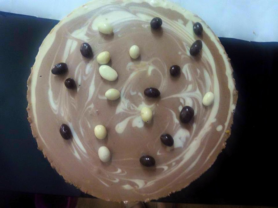 Mezclamos con un palillo toda la superficie sin tocar la base de galleta. Y al frigo unas 6 horas o de un día para otro mejor.
