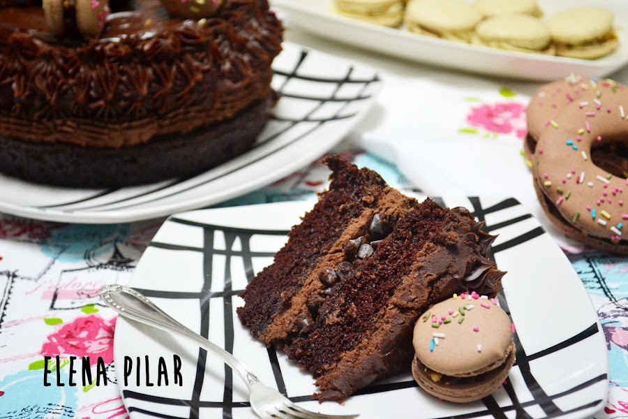 Y de la tarta en sí solo os puedo decir lo mismo de siempre: Los bizcochos quedan sorprendentemente esponjosos y la ganache de chocolate y café (la misma con la que rellené los marcarons) está tremendísima, para comerla a cucharadas. Lo que menos me ha convencido -aunque mínimamente- ha sido la crema de mantequilla del relleno (últimamente las buttercreams me saturan un poco). A pesar de ello, la inmensa cantidad de chips de chocolate que la acompañan hacen de ésta una tarta irresistible.