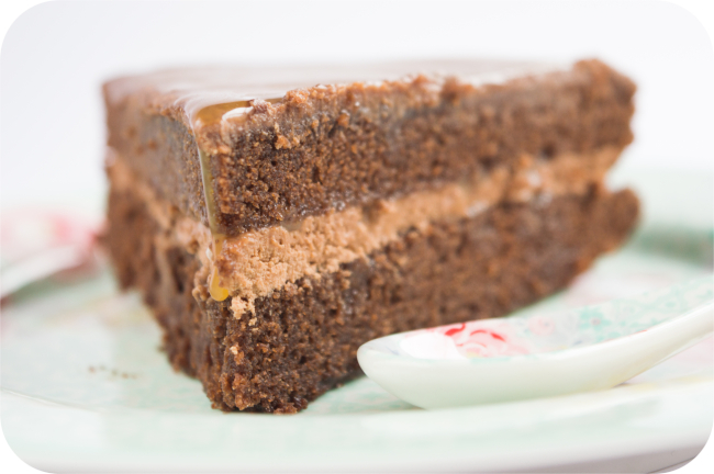 Y el montaje de la tarta es facilisimo... Cortamos el bizcocho por la mitad, rellenamos bien con la crema de mantequilla de chocolate con leche y si quieres una capa fina de caramelo salado (yo lo hice así), ponemos la capa superior de bizcocho y bañamos por completo con el caramelo salado.