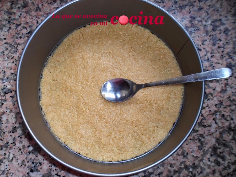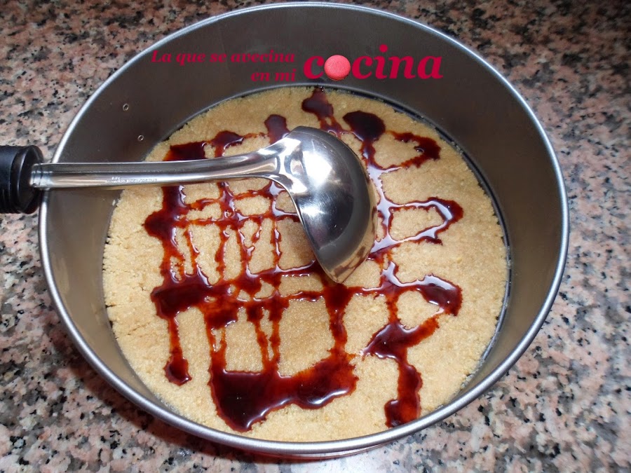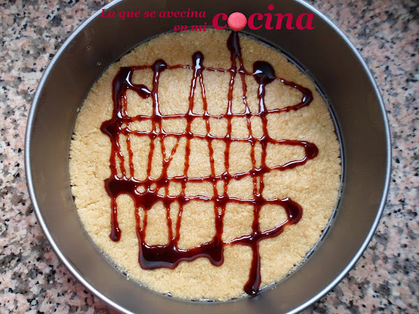 Si queréis podéis echarle un chorreoncito de caramelo líquido a la base. O bien, si os gusta más el chocolate, pues un chorreoncito de sirope de chocolate. Una vez que se lo echemos, ya sólo nos quedará meterlo en la nevera el tiempo en el que estaremos haciendo la tarta en sí. De esta manera se endurecerá y nos quedará una base fuerte.