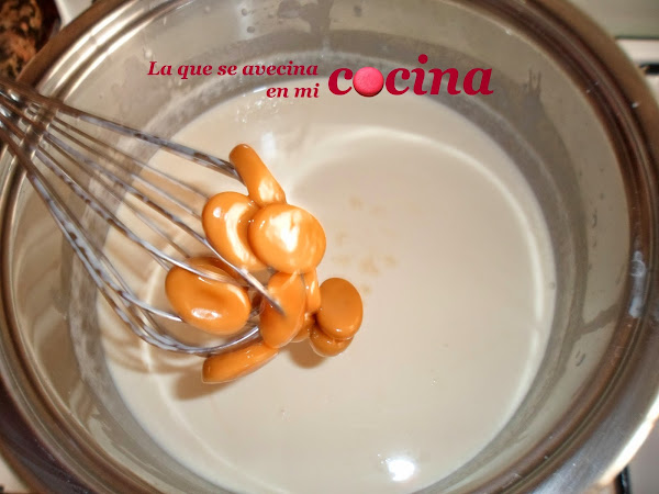 Para la tarta, comenzaremos poniendo en un cazo la leche y la nata (crema de leche) a calentar a fuego bajo. Cuando notemos que empieza a calentarse, agregaremos los caramelos y subimos el fuego a medio. Comenzaremos a remover para que los caramelos se vayan derritiendo poco a poco. Os pido paciencia porque es una tarea que lleva su tiempo, no es un tiempo exagerado pero vamos, que nuestro ratito removiendo nos lo tenemos que llevar.