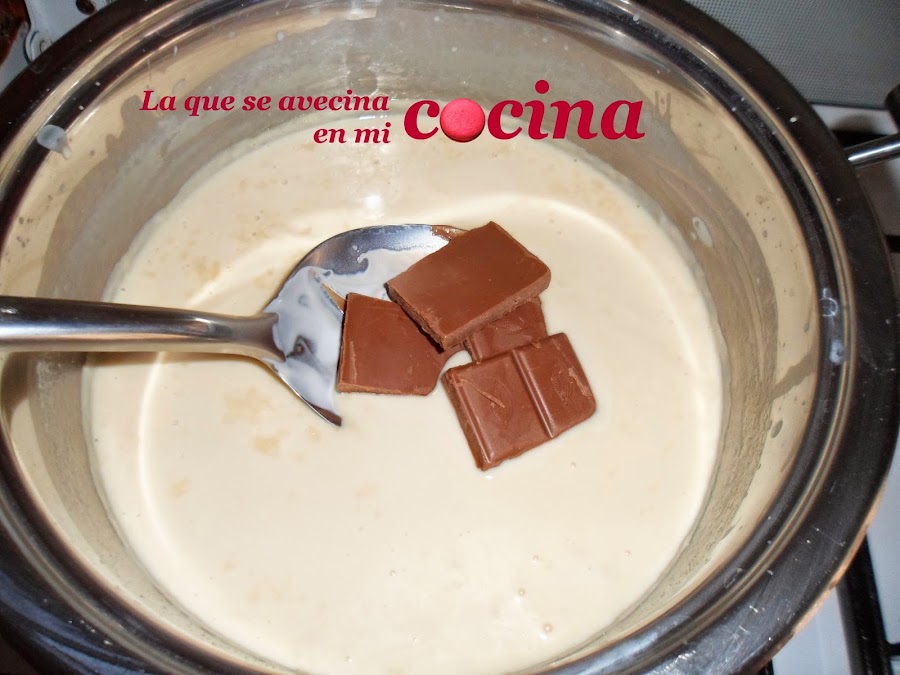 Una vez que notemos que se han deshecho por completo, añadimos el chocolate troceado para que se derrita más rápido. Igualmente seguimos removiendo para que se integre bien.
