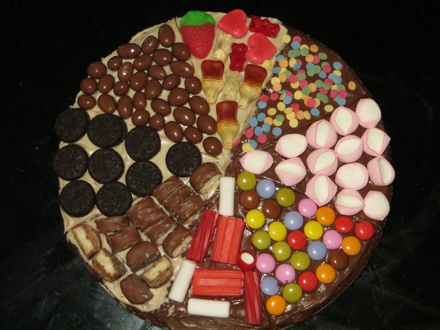 Sacamos y dejamos enfriar, luego untamos la mitad de nuestra tarta de crema de cacao blanca y la otra de crema de cacao negra y encima vamos colocando las golosinas, yo lo he hecho como si fuera una pizza y ha quedado muy chula, pero podéis ponerlas como más os guste. Si tenéis peques en casa esta tarta los volverá locos y a los mayores también.