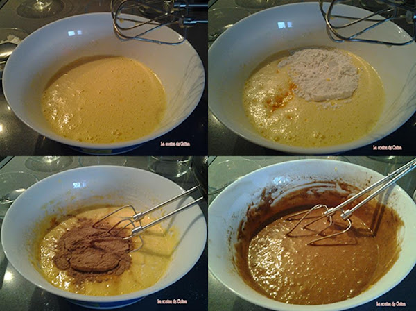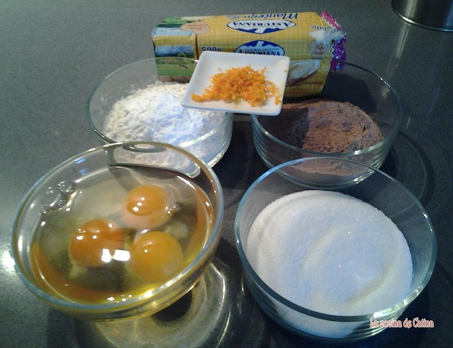 En un bol grande batimos los huevos con el azúcar hasta que estén espumosos, le añadimos la mantequilla y seguimos batiendo con las varillas eléctricas. Incorporamos el cacao y la ralladura de naranja, mezclamos, y por último la harina mezclada con la levadura, mezclamos bien y ponemos esta masa en el molde previamente untado con aceite o mantequilla. Metemos al horno durante 12 minutos.
