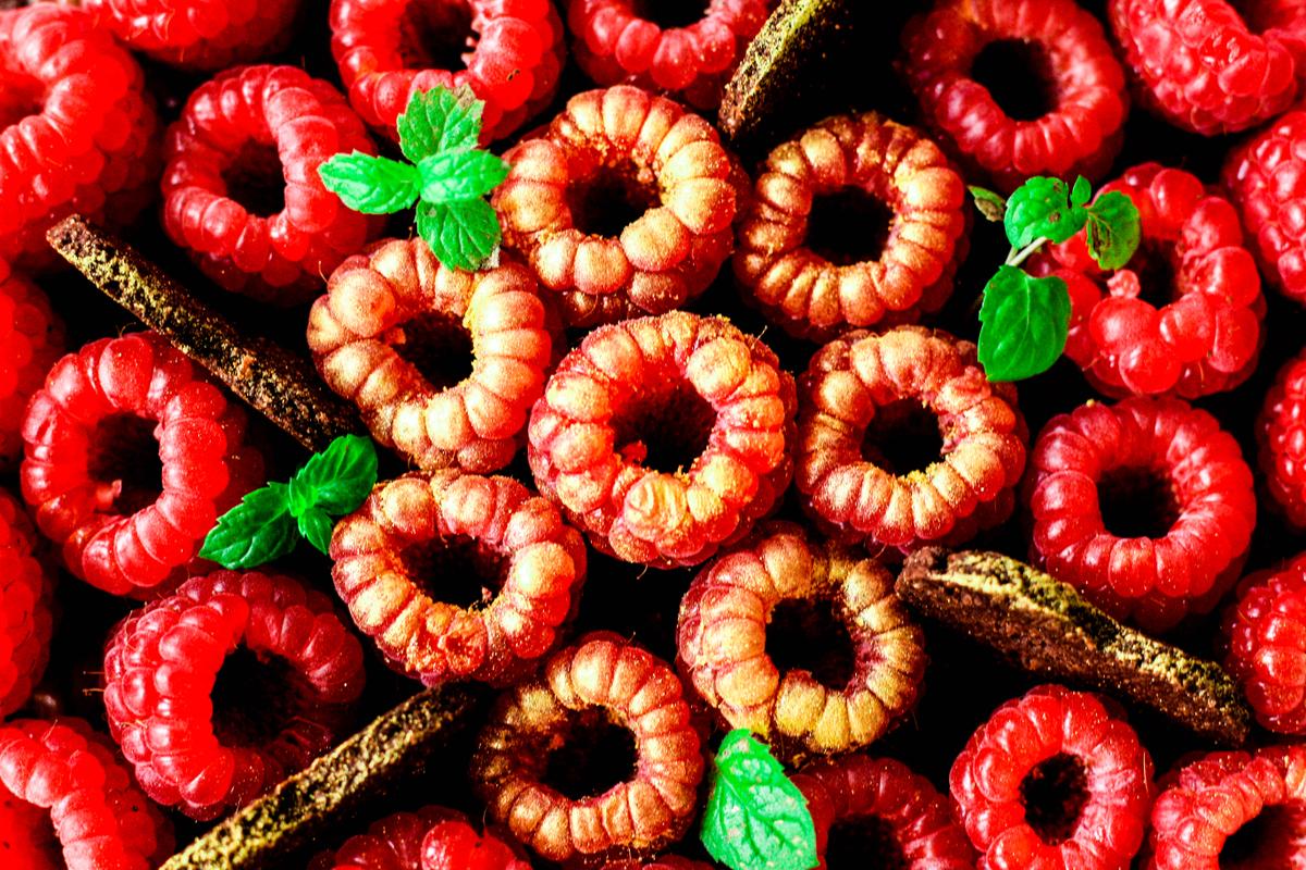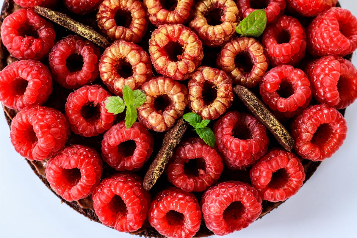 Lavar las frambuesas y dejar escurriendo. Pincelar algunas con un poco de polvo dorado.