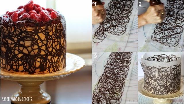 Para el enrejado de chocolate sólo hace falta una barra de chocolate de 200 g con un mínimo de 75% de cacao. ¡No utilicéis nunca el chocolate fondant por favor! Esta de la foto es la segunda tarta que hago así. Para la primera utilicé chocolate fondant y al rato, con la propia temperatura ambiente, el enrejado que sobresale de la tarta empecé a caerse! qué decepción!!! En la siguiente secuencia de fotos os muestro mi primer intento con esta tarta: