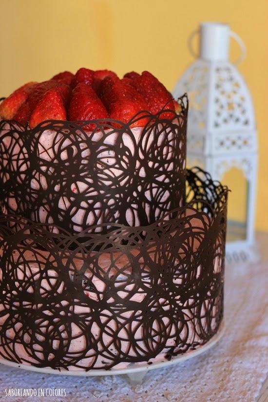 Se trata de una tarta de chocolate, rellena y cubierta de una buttercream con fresas, y ya veis, un enrejado hecho con chocolate que viene magnífico para decorar sin tener que recurrir al fondant o a la manga. Y la combinación de sabores (chocolate y fresas) resulta espectacular!