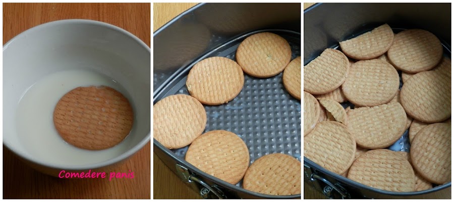 Pasamos las galletas una a una por la leche restante y vamos colocando las galletas en el fondo del molde desmoldable dónde queramos hacer la tarta, Colocamos dos capas de galletas.
