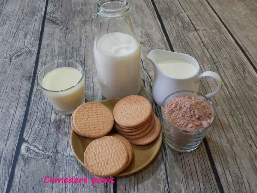 Después de colocar la primera capa de galletas cubrimos con una capa de chocolate, la mitad de la cantidad de chocolate. Sobre el chocolate ponemos dos capas más de galletas mojadas en leche y sobre ellas colocamos la nata (crema de leche).