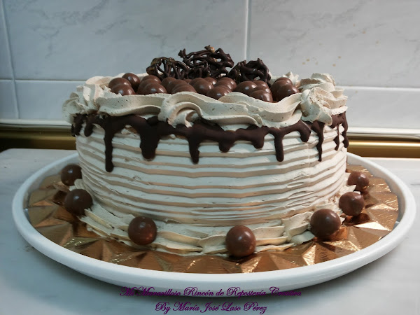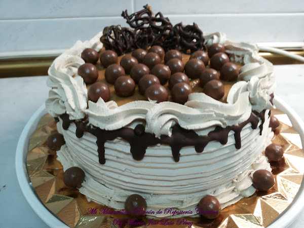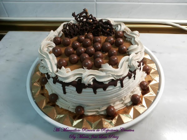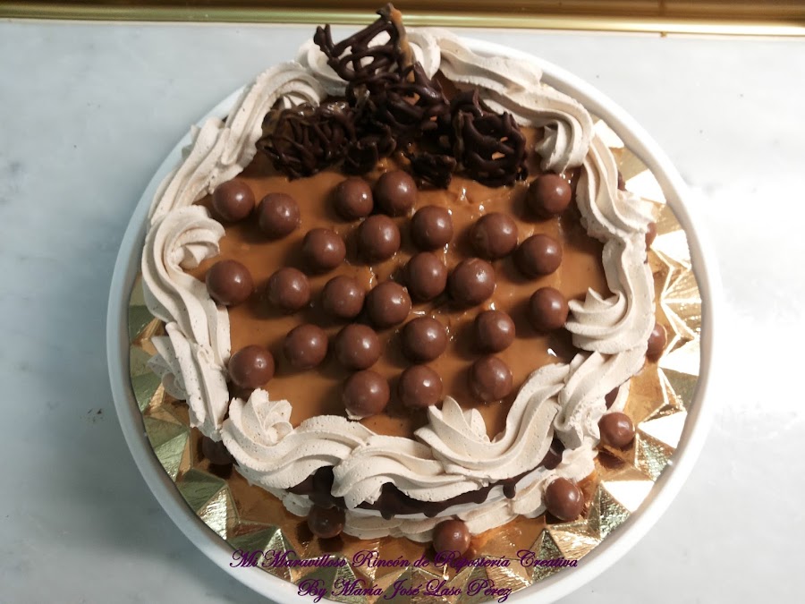 La cobertura lateral es de una deliciosa nata (crema de leche) vegetal con sabor a caramelo, la cubierta superior también es de dulce de leche, alrededor está decorado con un borde de chocolate fundido. Las bolitas de Maltesers dan el toque final a la elaboración.