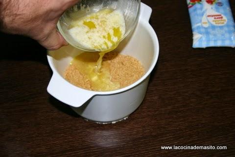 calentamos la mantequilla y la echamos en el bol donde tenemos las galletas trituradas