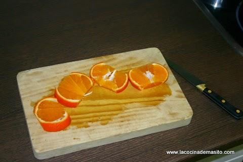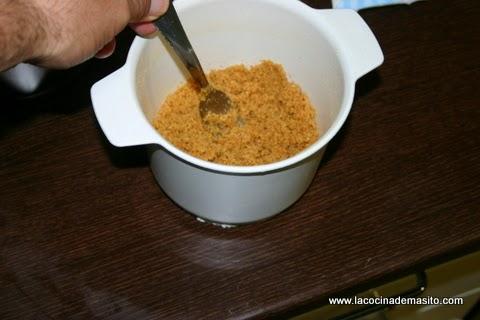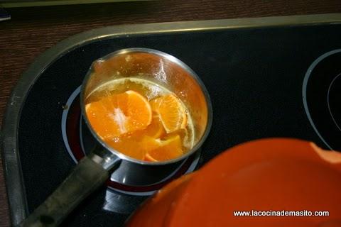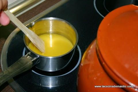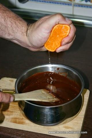 cuando este bien removido echamos el zumo de la mandarina, removemos y lo dejamos unos minutos que temple un poco
