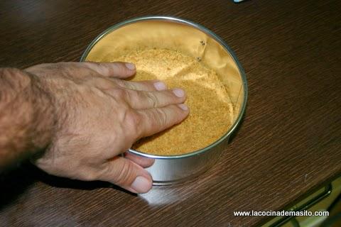 y lo echamos en la base del molde desmoldable, apretamos con las manos y lo reservamos en la nevera mientras preparamos el relleno