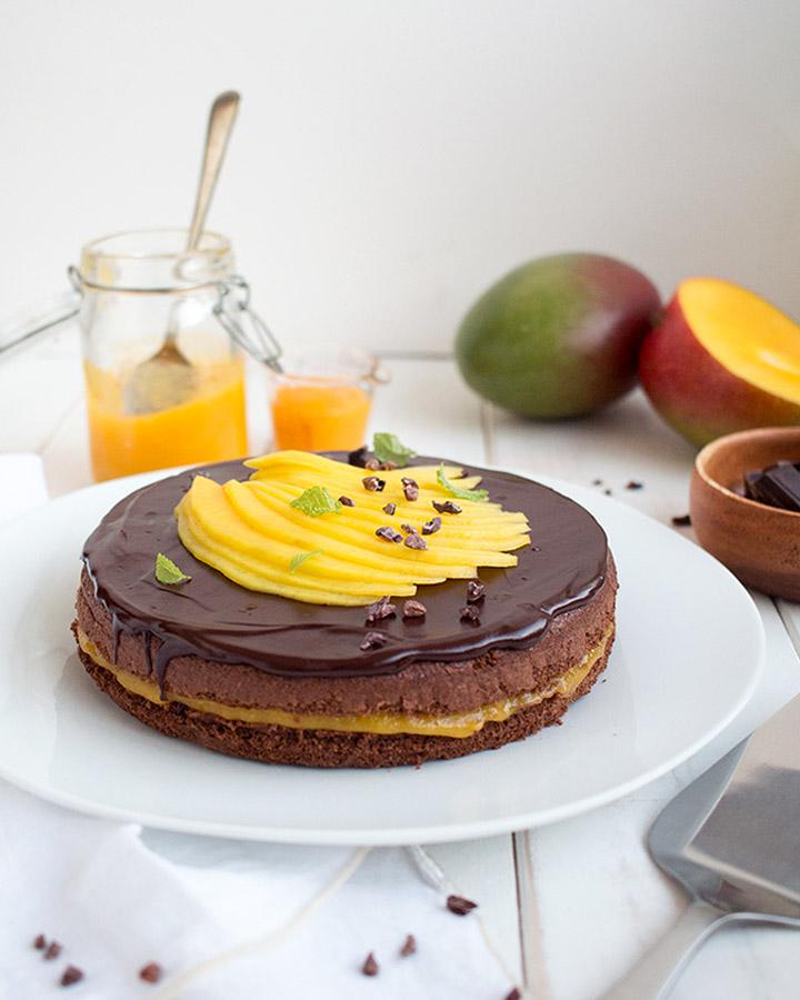 ¿Qué haces si te gusta el chocolate y el mango? Pues juntarlos en una Tarta de chocolate y mango deliciosa. El chocolate está presente en forma de cacao puro dentro del bizcocho y también en la cobertura, mientras que el mango es el protagonista del relleno de esta tarta.