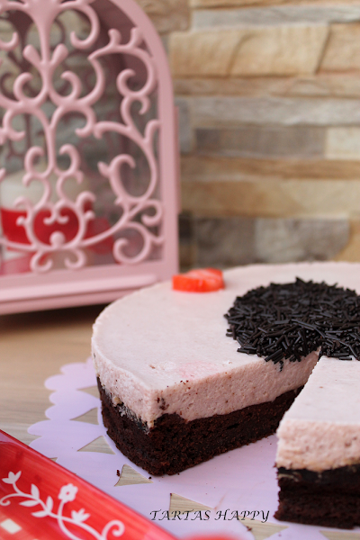 La receta que os traigo hoy es un bizcocho de chocolate sin harina, combinado con una mousse de fresas.
