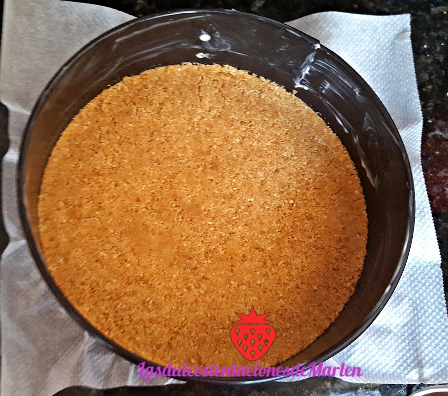 Trituramos bien las galletas , derretimos la mantequilla 1 minuto en el microondas. Luego une estos dos ingredientes hasta formar una masa con la que vamos a cubrir la base del molde. Extiende y aplana con la ayuda de una cuchara hasta dejar una capa uniforme. Metemos en el congelador.