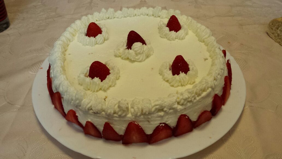 Si os animáis a hacerla podéis ver la receta aquí: tarta de nata (crema de leche) y fresas