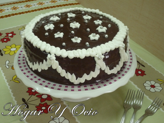4. Una vez que esté bien fría la tarta, decoramos con nata montada (crema de leche) azucarada y las perlitas, utilizando la manga pastelera. ¡Lista nuestra tarta, vamos a disfrutarla!