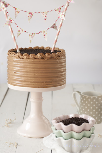 Para montar la tarta, colocamos el primero de los bizcochos sobre el plato y una porción de crema. Colocamos el segundo bizcocho y otra porción de crema. Terminamos con el último bizcocho y cubrimos toda la tarta con una capa fina de crema para sujetar las migas. Refrigeramos la tarta hasta que la crema se ponga dura.